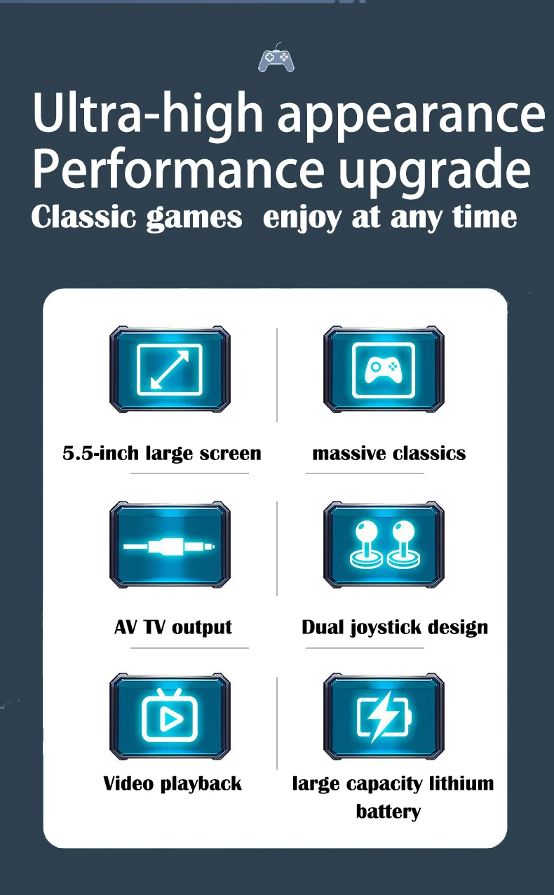 Powered by the latest flagship gaming chip, this handheld game player boosts performance and smoothness by over 80%, completely eliminating control lag. With 9 built-in classic game emulators, it's perfect for retro video game player fans who wish to relive arcade and retro gaming classics effortlessly.